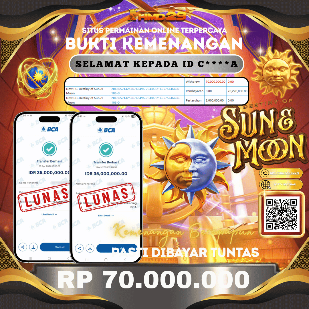 Selamat kepada User id : C****A Telah berhasil mendapatkan kemenangan besar pada permainan SLOTGAME Kemenangan sebesar RP 70,000,000,-JP BERAPAPUN TETAP KAMI BAYAR !!! HMD29 didirikan dengan prinsip fairplay dan kejujuran karena kenyamanan dan keamanan member adalah prioritas utama HMD29. segera bergabung bersama kami dan dapatkan pengalaman bermain judi terbaik. Hanya di HMD29 bisa dengan mudah memenangkan hadiah hingga ratusan juta rupiah. AYO SEGERA DAFTARKAN DIRI ANDA DI HMD29 dengan minimal deposit Rp.10.000.- & minimal withdraw Rp.10.000. Terima kasih kepada pemenang karena sudah mempercayakan kami sebagai gamebling terpercaya yang membayar semua kemenangan member