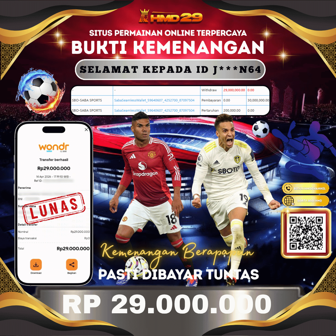 Selamat kepada User id : J***N64 Telah berhasil mendapatkan kemenangan besar pada permainan SPORTBOOK Kemenangan sebesar RP 29,000,000,-JP BERAPAPUN TETAP KAMI BAYAR !!! HMD29 didirikan dengan prinsip fairplay dan kejujuran karena kenyamanan dan keamanan member adalah prioritas utama HMD29. segera bergabung bersama kami dan dapatkan pengalaman bermain judi terbaik. Hanya di HMD29 bisa dengan mudah memenangkan hadiah hingga ratusan juta rupiah. AYO SEGERA DAFTARKAN DIRI ANDA DI HMD29 dengan minimal deposit Rp.10.000.- & minimal withdraw Rp.10.000. Terima kasih kepada pemenang karena sudah mempercayakan kami sebagai gamebling terpercaya yang membayar semua kemenangan member