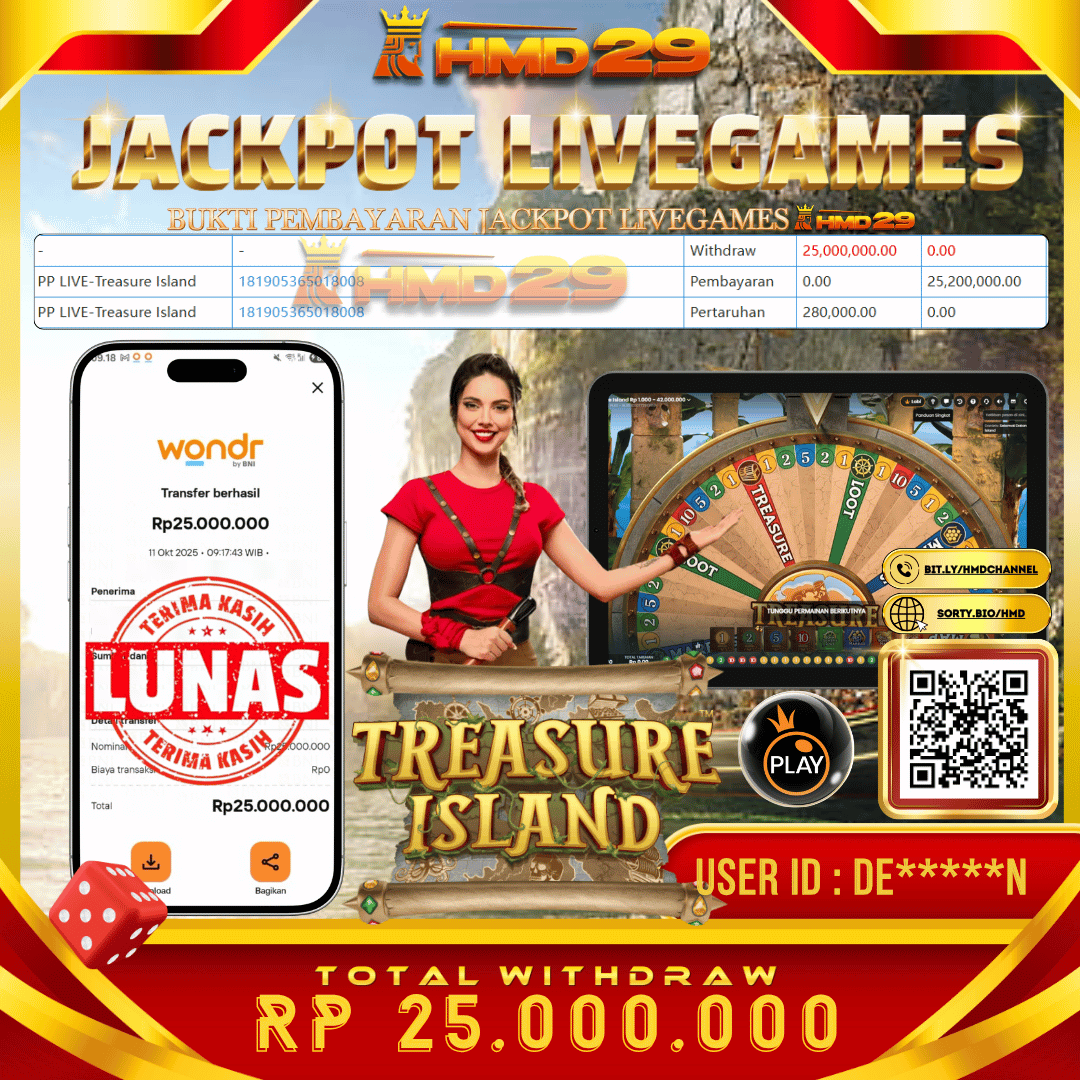HMD29 JACKPOT LIVEGAME TREASURE ISLAND RP 25,000,000 ,-