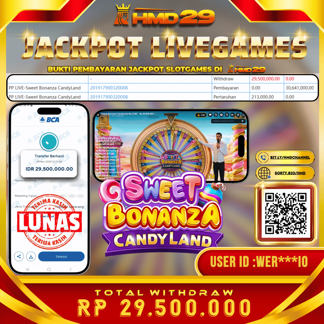 HMD29 JACKPOT LIVEGAMES SWEET BONANZA CANDYLAND RP 29,500,000,-