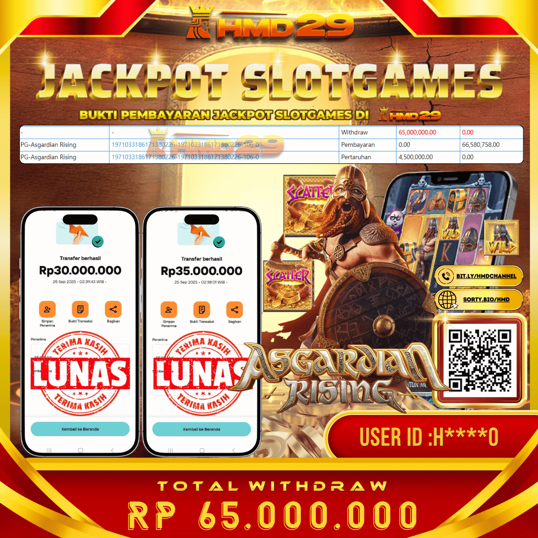 HMD29 JACKPOT SLOT ASGARDIAN RISING RP 65,000,000 ,- LUNAS