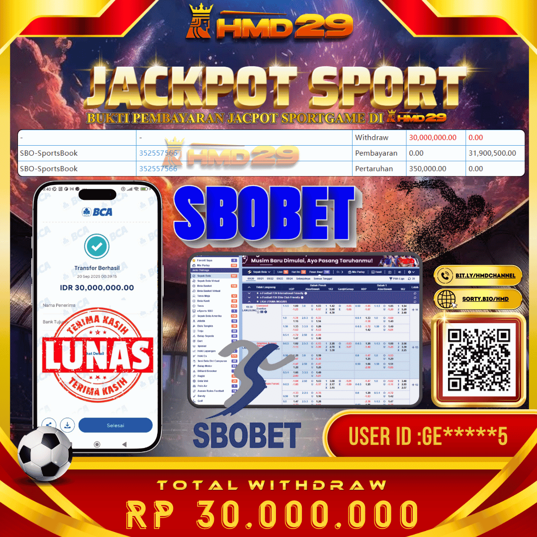 HMD29 JACKPOT SPORT SBOBET RP 30,000,000 ,- LUNAS
